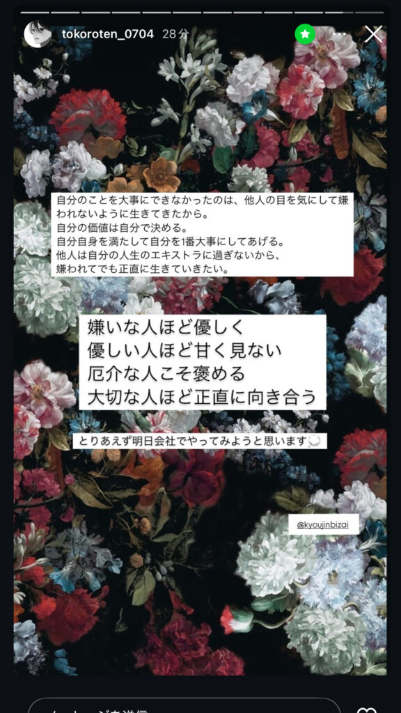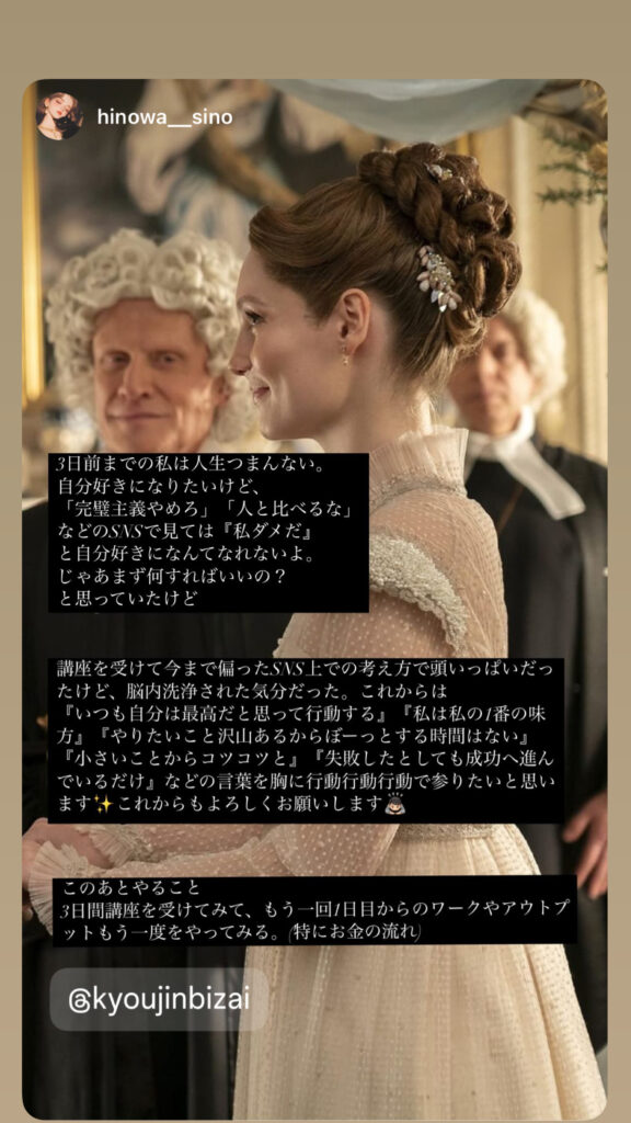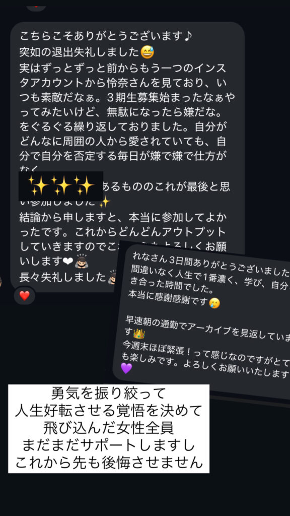 自分に自信がなく自分を好きになれない現状を変えたくて受講を決意しました。令奈さんのインスタを毎日見ていて自分に刺さる言葉が多かったので、令奈さんのもとで学びたいと思いました。