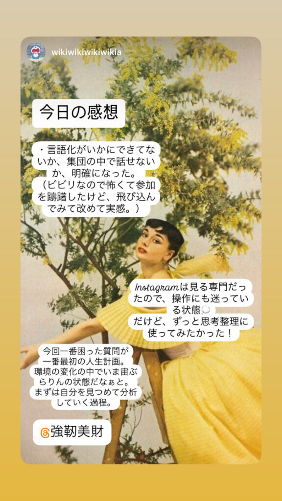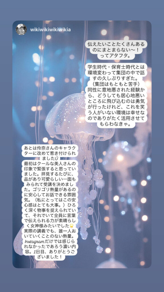 受講していなかったら、自分の本心にも気が付かず、なんとなく友達と過ごし、なんとなく買い物をし、なんとなくやりたくもないデスクワークをし、誰かのコピー人間になり、ふわふわ適当に生きていくことになっていたと思います。