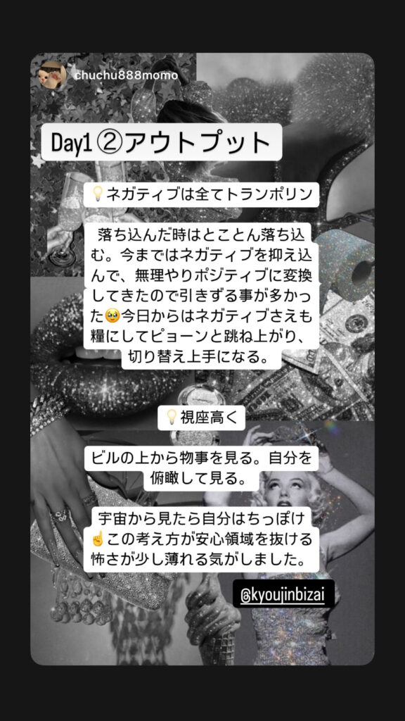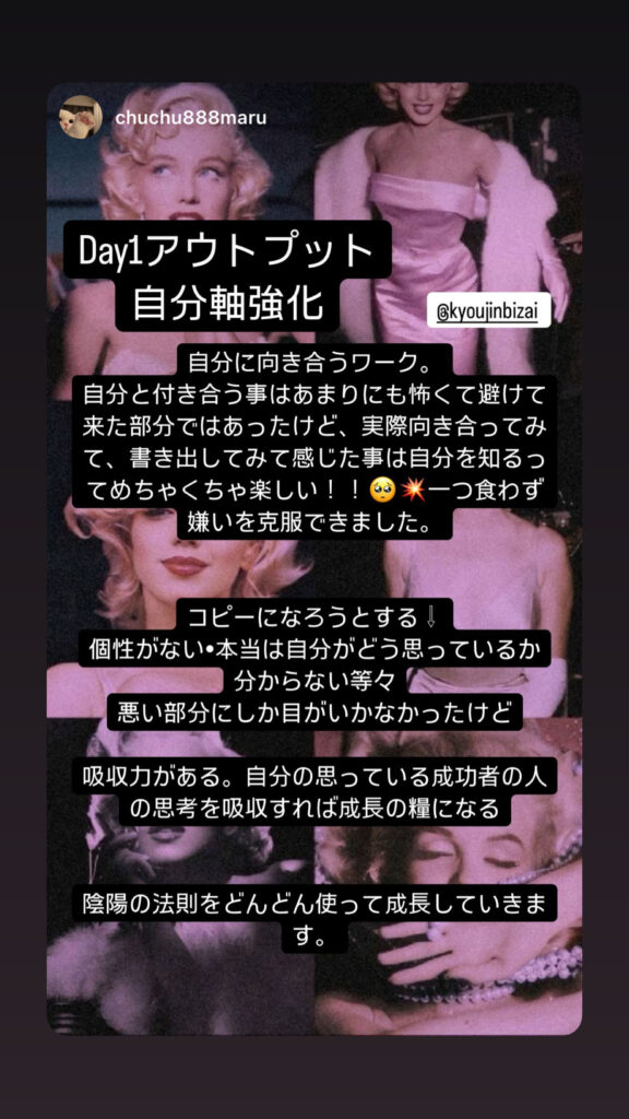 やることはけっこうシンプルですが、行動し続ける覚悟、今まで継続できなかった原因、余計なことをする暇がないということ、自分と向き合ったその先…たくさんの方が明確になり始めました。変人になるのも怖くなくなりました。