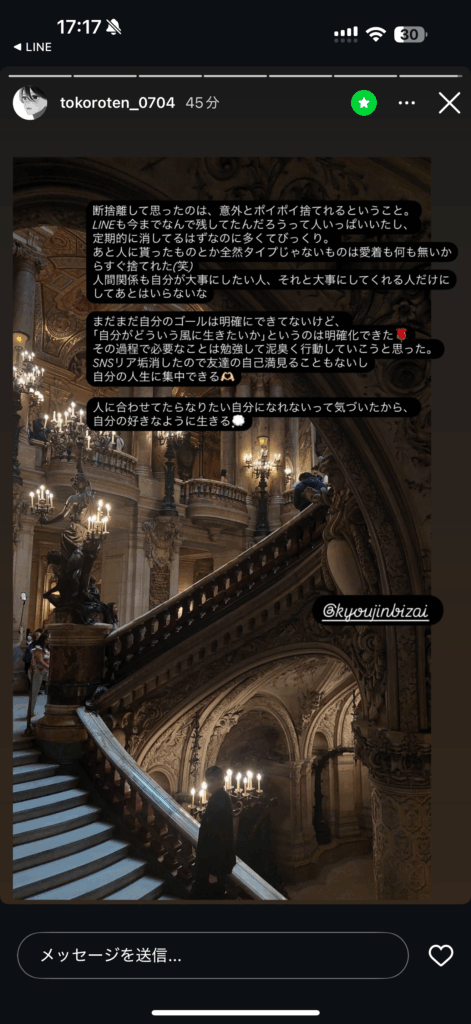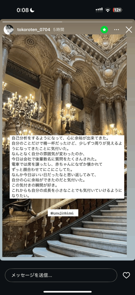 仕事を辞めて好きなこともやる事もなくて、そんな自分が嫌で嫌でインスタで見つけたレナさんの「ショート動画のスワイプをやめろ」が強烈に自分に突き刺さり、レナさん・ルベンシアに興味を持ちました。