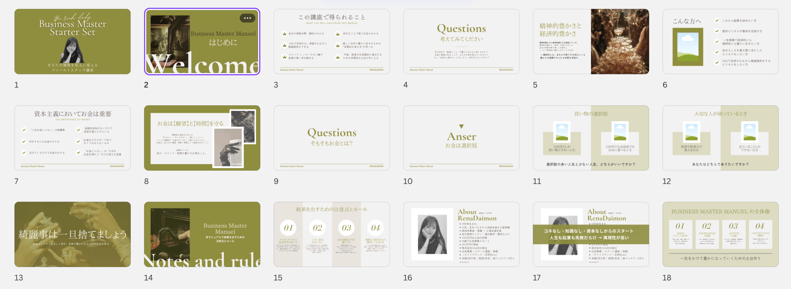 起業初期のマインドからSNS発信方法、商品設計とポリシー、そもそもどうなりたいか?というところから実際に今何をしたらいいかTodo作成までを一式まるまるまとめております。